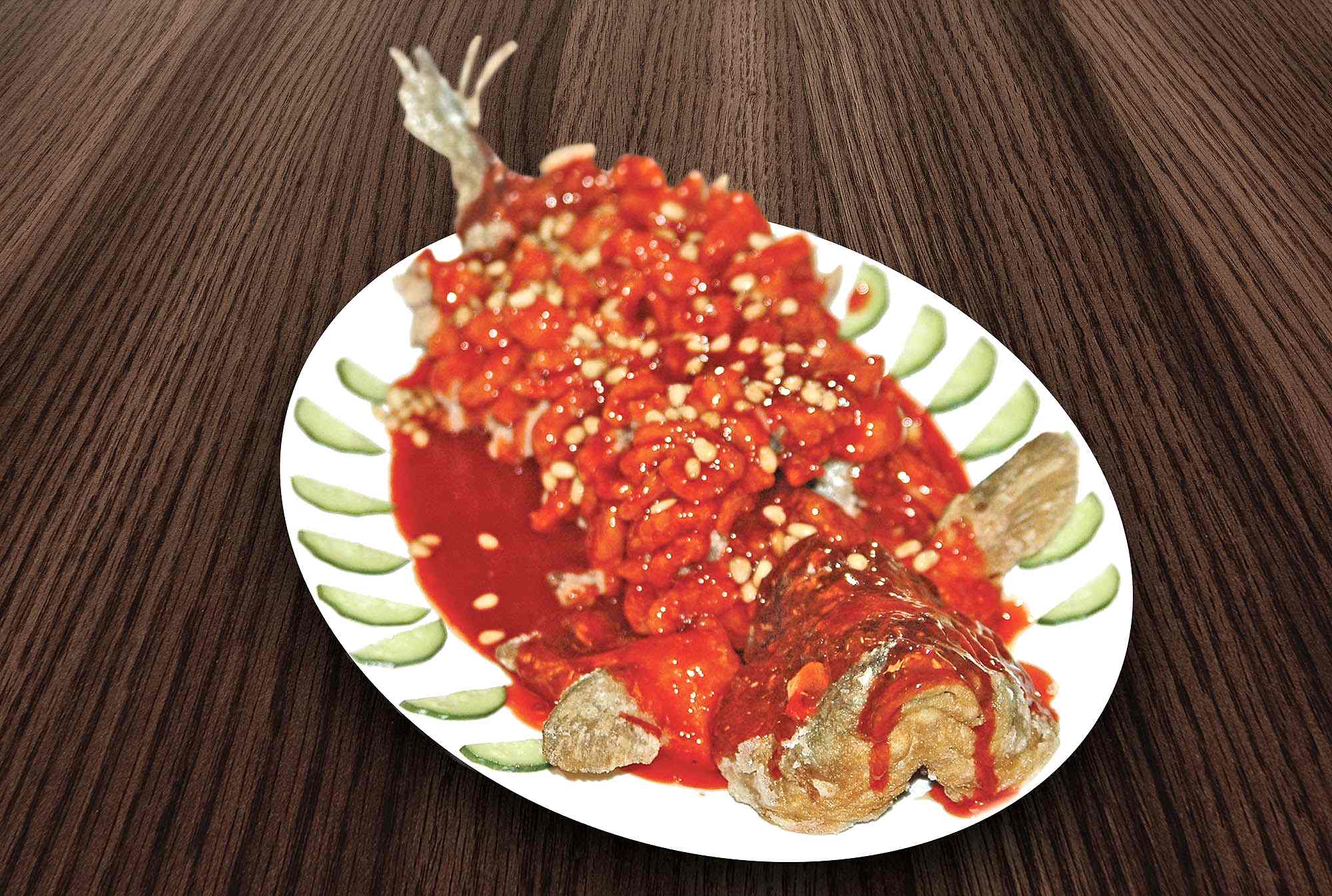 Состав: карп в кисло-сладком соусе, Pin-Up орех, подается целой рыбой.Цена за 100 г.Готовится по весу целая рыба.